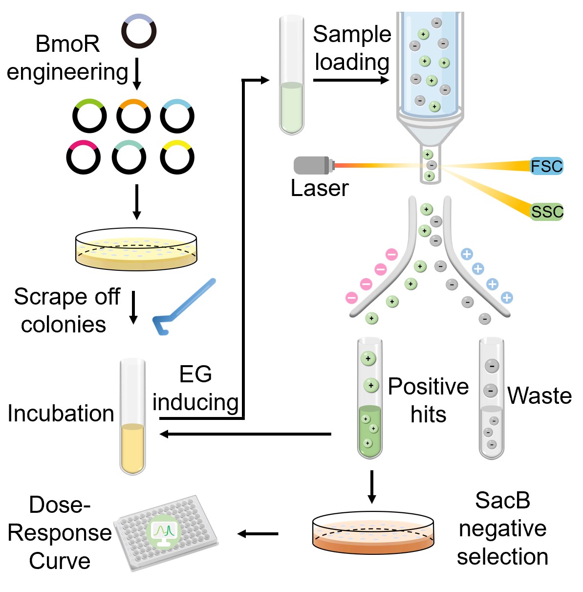 图1 FACS协助的EG特异性响应BmoR突变体的筛选流程