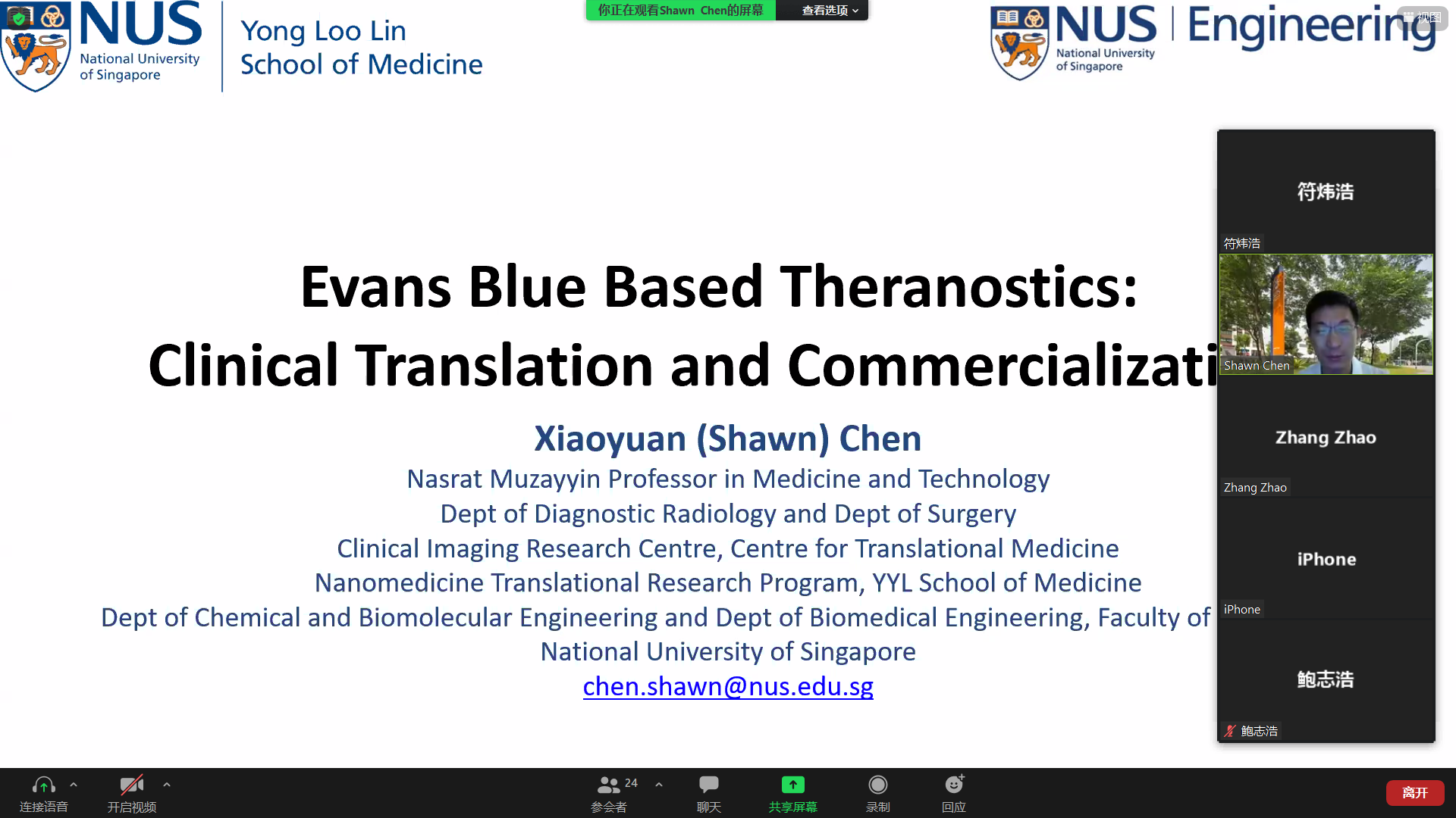 应北京理工大学betway西汉姆联唐晓英教授邀请,2021年09月16日,新加坡国立大学陈小元教授通过Zoom软件为betway西汉姆联师生作了题为《Evans Blue Based Theranostics: Clinical Translation and Commercialization》的学术报告。报告由betway西汉姆联张钊同学主持,betway西汉姆联高天欣老师等教师及研究生、本科生等七十余人参加了报告会。