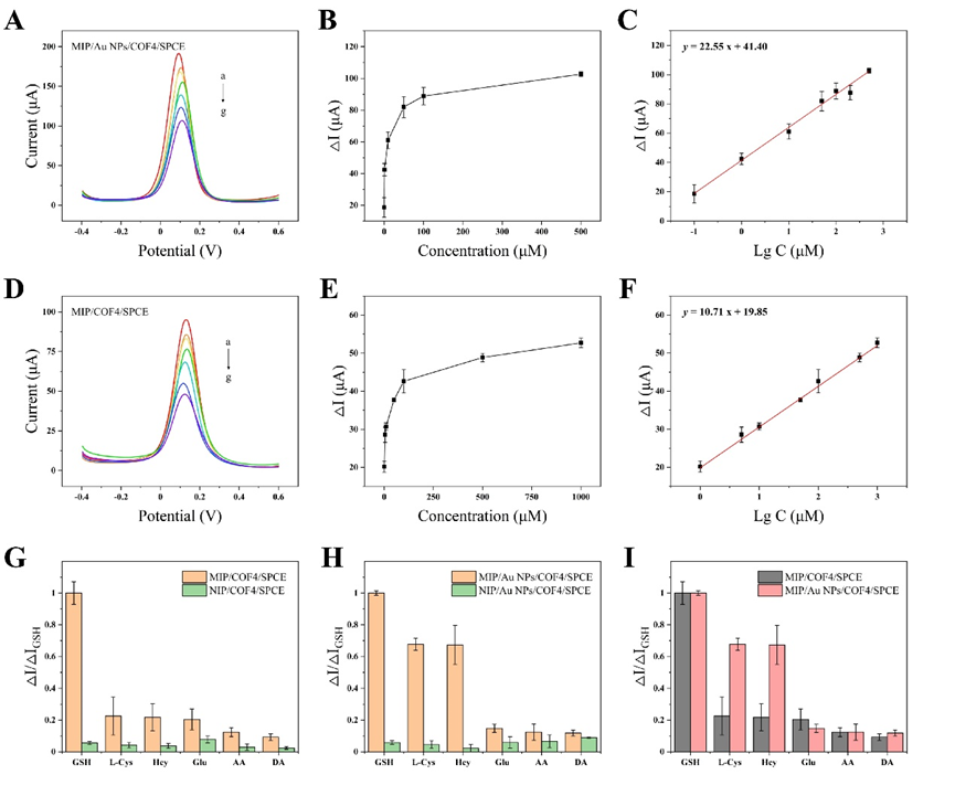 通过合成工程优化了各种导电的氮杂稠合COF。通过使用不同的混合溶剂和调节剂来控制溶剂极性,成功合成了具有不同形貌和电导率的COF。其中,选择电导率最高的2D晶体COF4来修饰丝网印刷碳电极(SPCE),使电流响应提高了240%。在最优的实验条件下,采用DPV测量确定了MIP/COF4/SPCE和MIP/Au NPs/COF4/SPCE检测GSH的宽线性范围和高灵敏度。