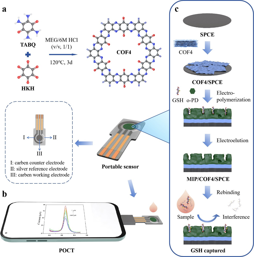 共价有机框架 (Covalent organic framework, COF) 在电化学传感领域引起了极大兴趣。然而,大多数 COF 被集成为富集单元或反应载体,并与金属纳米材料共同改性。很少有研究使用单一原始 COF 作为电化学信号放大单元。氮杂融合 π 共轭 COF 表现出出色的信号增强效果,是电化学传感应用的有效电子传输层。在本研究中,通过合成工程优化了不同的导电氮杂融合 π 共轭 COF。其中,电导率最高的 2D 晶体 COF4(信号为裸电极的 240%)被用于修饰丝网印刷碳电极,构建了便携式分子印迹电化学生物传感器,用于即时检测谷胱甘肽。与传统的与金纳米粒子共同改性的策略相比,单一导电 COF4 电化学传感器表现出优异的检测性能和对硫醇干扰物更好的选择性。