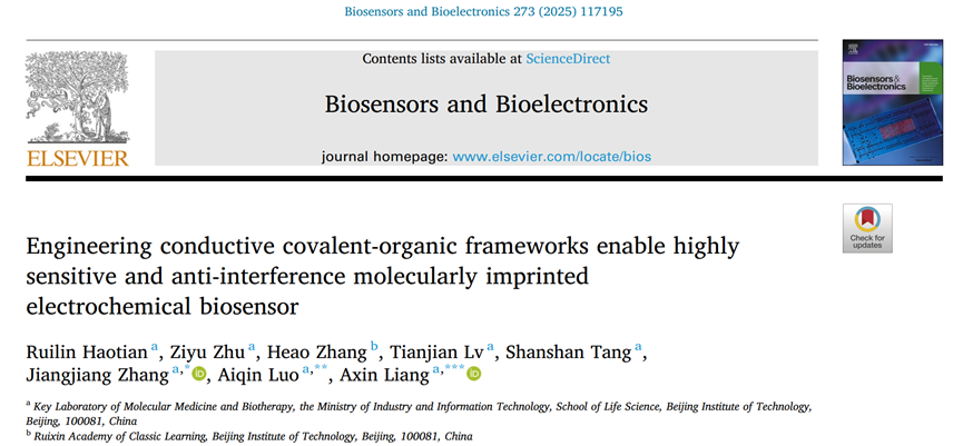 近日,北理工betway西汉姆联罗爱芹教授团队在期刊Biosensors and Bioelectronics(中科院一区TOP,IF="10.7)发表了题为Engineering" conductive covalent-organic frameworks enable highly sensitive and anti-interference molecularly imprinted electrochemical biosensor的研究论文,该论文构建了基于单一修饰导电共价有机框架修饰的分子印迹电化学传感器,可以用于谷胱甘肽的高灵敏度、高选择性检测。该工作以北京理工大学为第一通讯单位,第一作者是硕士生浩天瑞霖,通讯作者为团队成员罗爱芹教授、梁阿新助理教授和张江江助理教授。