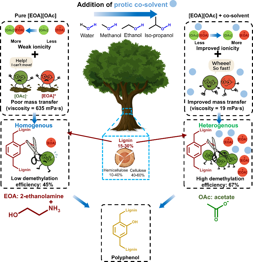 图1. 质子溶剂促进[EOA][OAc]中木质素脱甲基反应.