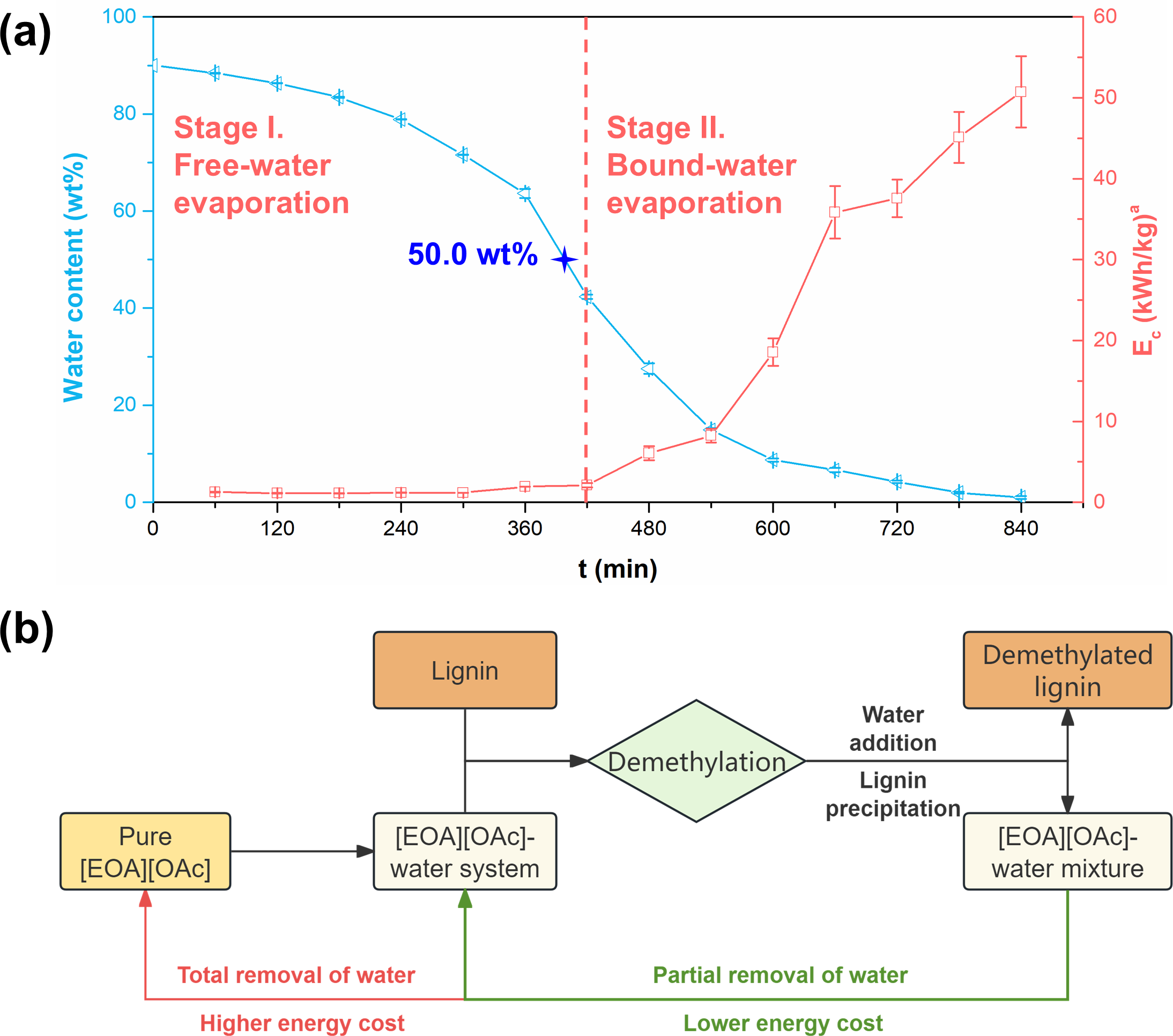 研究表明,水的引入可使体系黏度降至约为初始值的1/34,显著改善反应传质条件;也可强化[EOA][OAc]的离子化程度,促进了由[OAc]-诱发的SN2机理木质素脱甲基。同时,水在该体系中兼具双重功能:作为共溶剂可加速木质素脱甲基进程,作为反溶剂则能实现木质素的分离沉淀;这一特性使离子液体的分离与回收操作更简便。初步能耗评估结果显示,本研究发展的含水PIL体系回收方法,相较于传统的纯离子液体回收方法,可降低约44%的能耗(图3a),并大幅缩短干燥时间。