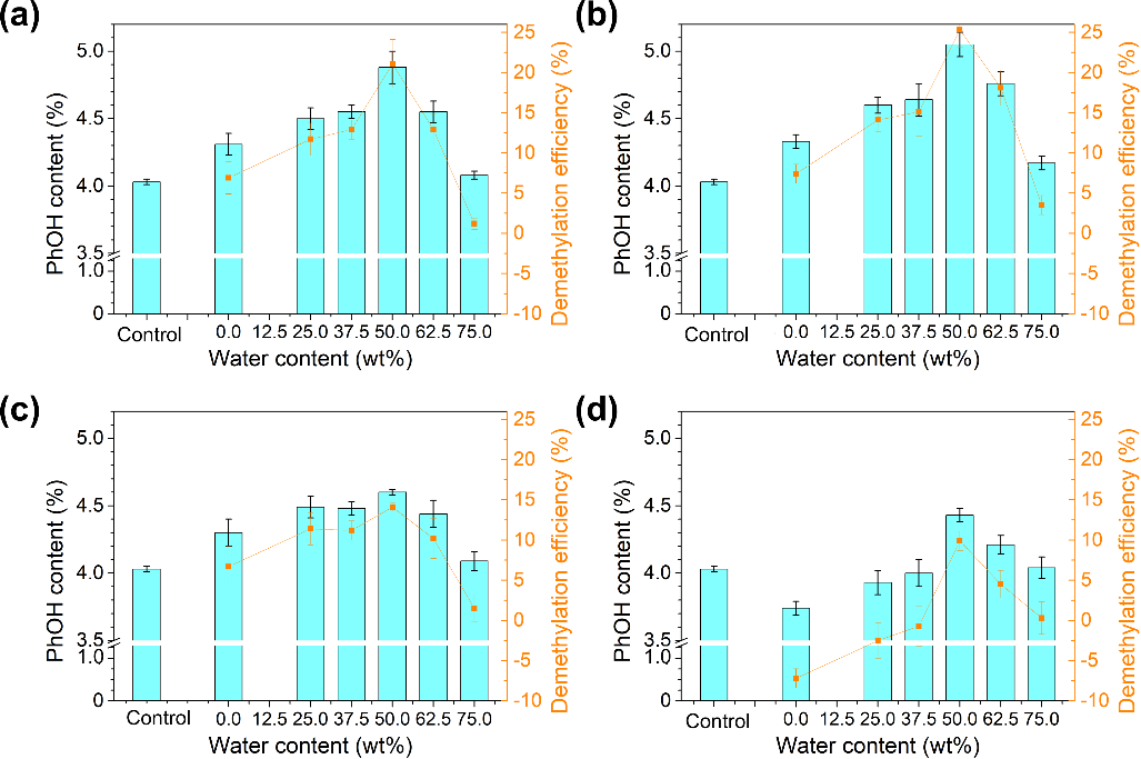 图2. 在60 °C(a)、70 °C(b)、80 °C(c)、90 °C(d)下,水含量对[EOA][OAc]-水体系下木质素脱甲基的影响.