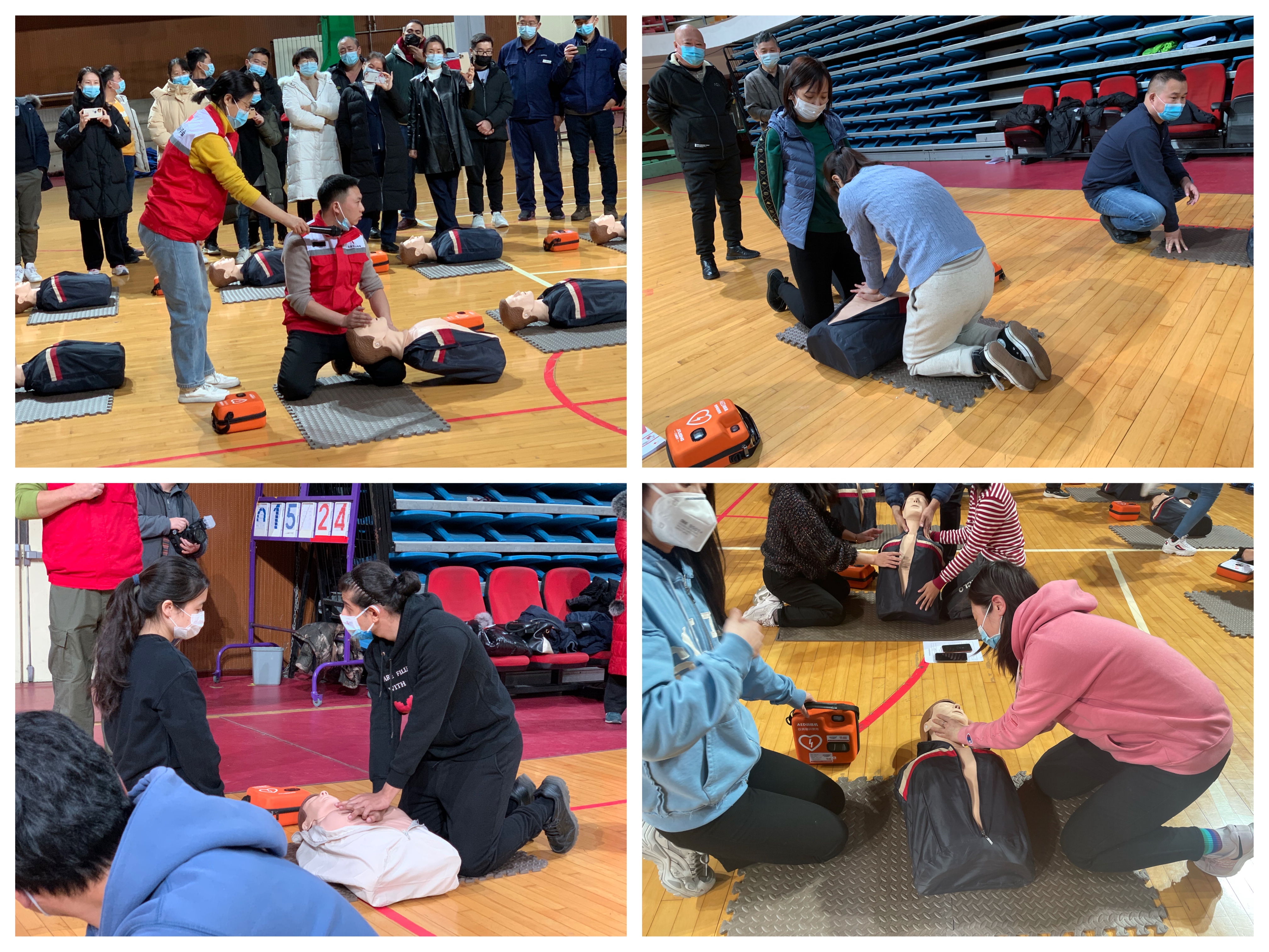 为提高师生急救知识,熟悉心肺复苏(CPR+AED)操作技能,具备为他人施救能力,betway西汉姆联联合后勤基建处于2021年12月23日下午13:30在体育馆篮球场组织学院师生参加北京市红十字会举办的心肺复苏(CPR+AED)应急救护培训。