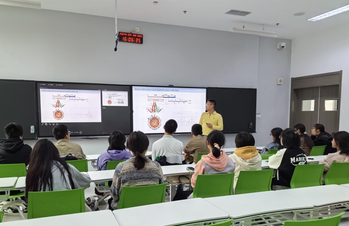 郗冀详细介绍了所从事的研究领域发展前沿,讲解了乙肝病毒的特点及蛋白调控的技术进展,并从科学研究中如何发现问题、研究问题、解决问题的方法角度,启发同学们保持好奇心,大胆假设,小心求证,开展科学研究。互动交流中,郗冀分享了在自己的求学工作经历和在学校期间的学习体会,围绕同学们关心的大学成长、文献阅读、兴趣选择、人生规划等方面分享了体会和建议,勉励同学们积极探索、寻找兴趣方向,树立目标坚持不懈努力。