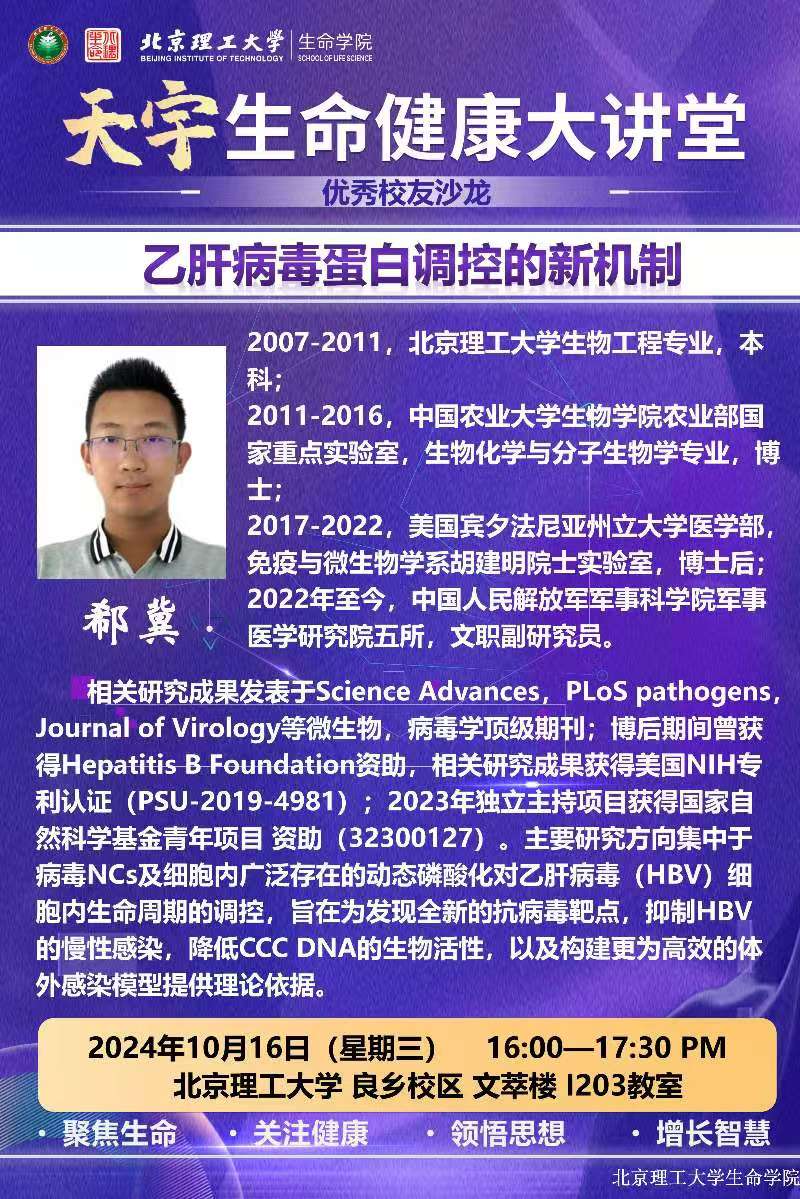 10月16日,betway西汉姆联协同求是书院,开展校友进书院活动,邀请了2007级本科优秀校友、军事医学研究院郗冀副研究员做了一场主题为“乙肝病毒蛋白调控的新机制”学术讲座,求是书院本科生参加了交流活动。活动由betway西汉姆联副书记副院长郭惠芝主持。
