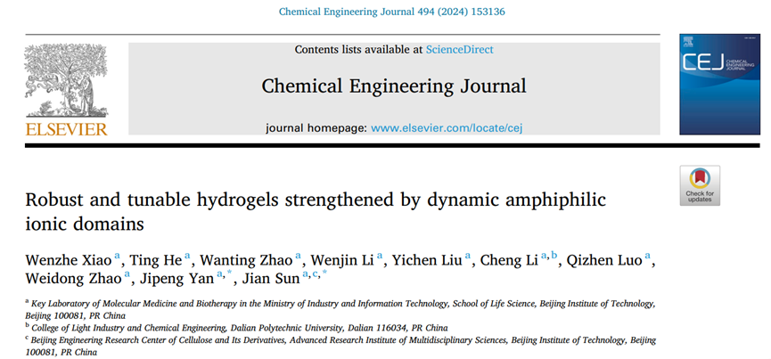 Wenzhe Xiao, Ting He, Wanting Zhao, Wenjin Li, Yichen Liu, Cheng Li, Qizhen Luo, Weidong Zhao, Jipeng Yan,* Jian Sun*, Robust and tunable hydrogels strengthened by dynamic amphiphilic ionic domains. Chem. Eng. J. , 2024, 494, 153136.