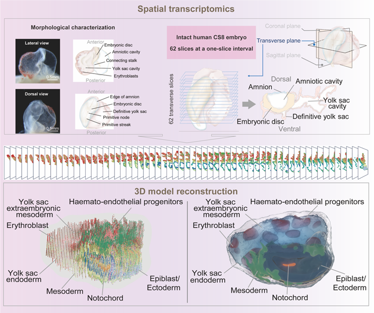 在本研究中,通过构建完整的人类原肠胚3D模型,将单个细胞的空间信息与其基因表达相结合,系统描绘了胚胎形态、细胞类群、空间位置和转录组特征,准确注释了不同的细胞亚型,证明了中胚层不同亚型先特化后迁移的假说、深度解析了重要胚外组织羊膜细胞发育过程和卵黄囊造血谱系特化,同时针对原肠胚前-后、背-腹、左-右体轴关键信号通路进行解析,提出胚胎尾部可能存在新的信号源和“组织者(organizer)”的观点。这项研究不仅可以确定人类原肠胚形成过程的关键细胞和分子特征,还可以指导今后基于干细胞的人类胚胎模型的生成。