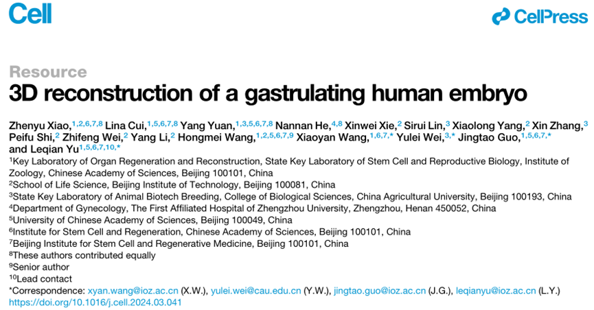2024年4月23日,北京理工大学betway西汉姆联肖振宇副教授、中国科学院动物研究所王红梅研究员、于乐谦研究员、郭靖涛研究员等在国际学术期刊Cell发表文章《3D Reconstruction of a Gastrulating Human Embryo》,基于芯片技术和三维动画重构技术首次重构高分辨率人类三维数字原肠胚,填补原肠胚阶段人类胚胎发育知识空白,为理解人类早期胚胎发育及相关疾病提供重要资料,为改善不良妊娠结局奠定科学基础(图一)。