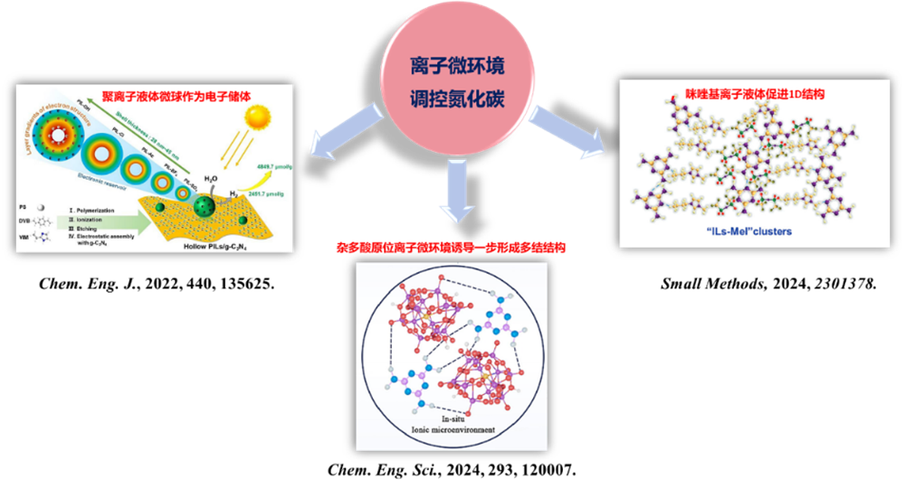 作为一种可见光响应的非金属有机半导体,石墨相氮化碳(g-C3N4)具有合成简单、物化性质稳定、绿色经济、带隙宽度合适等优点,被广泛应用于污染物降解、光解水制氢、光动力抗菌等方面。为了弥补改善g-C3N4比表面积低、载流子复合严重、可见光利用率低等缺陷,需要对其进行结构改性和性能优化。作为一种可以影响材料制备、改性和应用的功能介质,离子液体自身结构可设计和调节,根据需要可以发挥溶剂、模板剂以及结构修饰剂等功能,从而在构建内建电场、异质结、均质结以及杂原子掺杂等方面具有潜在应用潜力。为此,团队分别开展了不同类型的离子液体对g-C3N4结构及性能改性研究,旨在获得离子液体的特殊离子微环境对于半导体催化剂的结构调控和性能提升的机制和规律。相关系列进展包括:提出了以聚合离子液体微球作为“电子储体”的结构后修饰策略,获得了性能提升的产氢效果( Chem. Eng. J. , 2022, 440, 135625);通过均相咪唑基离子液体作为溶剂,调控构筑“IL-Mel”簇,实现了对g-C3N4表界面性质的改善,将光降解效率提高到2.3倍,并在细菌感染伤口的光动力治疗中表现出优异的性能( Small Methods , 2024, 2301378)。