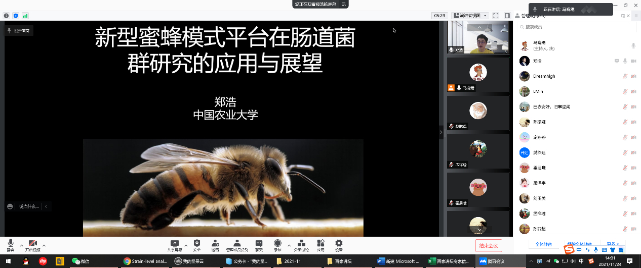 为加强学术交流,应betway西汉姆联霍毅欣教授邀请,中国农业大学食品科学与工程学院郑浩教授于11月24日带来了题为《新型蜜蜂模式动物在肠道菌群研究的应用与展望》的线上学术报告。报告由马晓焉副研究员主持,近40名师生参加了本次报告。