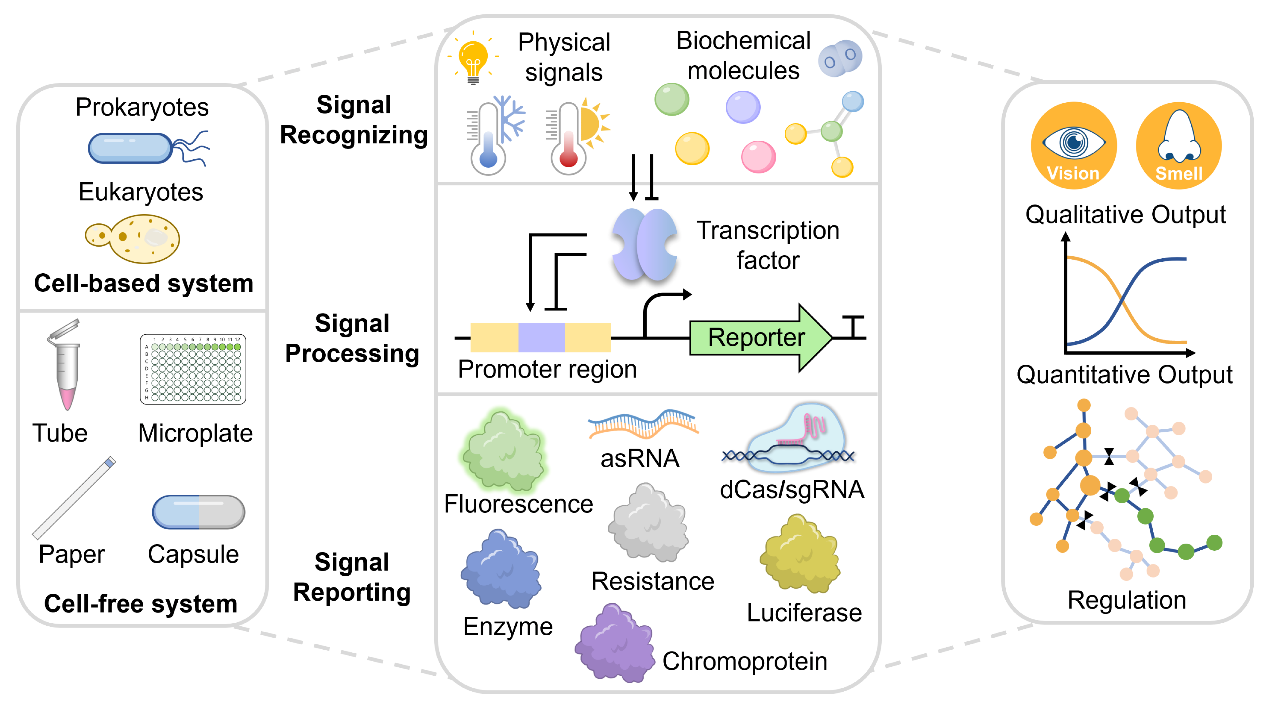 蓬勃发展的生物技术经济依赖于生物工具和技术的不断进步。DNA 合成在可支付性、成分标准化方面的提升以及计算机算法技术的进步,有力地推动了各种遗传元件在生物传感器开发中的应用。基于转录因子(transcription factor, TF)的生物传感器(transcription factor-based biosensor, TFB)因其具备模块化、多样性、集成化和可定制性等特点,受到了广泛的关注。TF本质上是一种具有特殊结构和功能的调节蛋白,会在响应特定生物信号时发生构象变化。生物体借助 TF介导的调节作用来调控代谢通量,并维持整体代谢网络的平衡。TF在识别输入配体后,可以结合或游离于配对启动子区域内或附近的TF结合区(TFBR)。这种相互作用通过影响RNA聚合酶(RNAP)与启动子的结合来调节下游基因的转录。基于其传感特性,TF被广泛用于开发基于细胞或无细胞的生物传感系统,用于分子检测或途径调控。生物传感过程通常包括三个阶段:信号识别、信号处理和信号报告(图1)。输入信号通常是物理因素(如光、温度、渗透应力)或生化分子(如代谢物、环境污染物、有毒化合物、生物标志物、氧、和pH)。这些细胞内/细胞外生物信号通过基于TF的遗传回路进行处理,然后转导成其他信号进行定性或定量输出或通路调控。