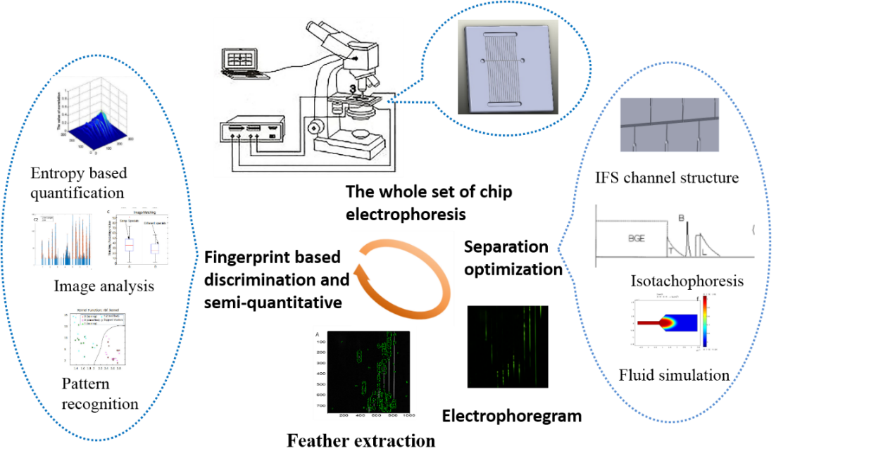 近些年来,针对新发和突发传染病爆发,未知、部分未知以及不断突变病原体的快速检测是及时发现和有效控制传染病疫情的关键之一,课题组利用微流控芯片的高效和集成化优势,并借助计算机流体动力学模拟仿真,实现了微生物细胞全蛋白微流控芯片多维高通量高分辨电泳分离。进一步分别利用了基于尺度不变特征变换算法的图像特征提取,全局信息熵和支持向量机等图像分析技术解析精细电泳分离指纹图谱,实现了混合样品中未知微生物的鉴别和半定量分析。(https://doi.org/10.1016/j.chroma.2021.462797)