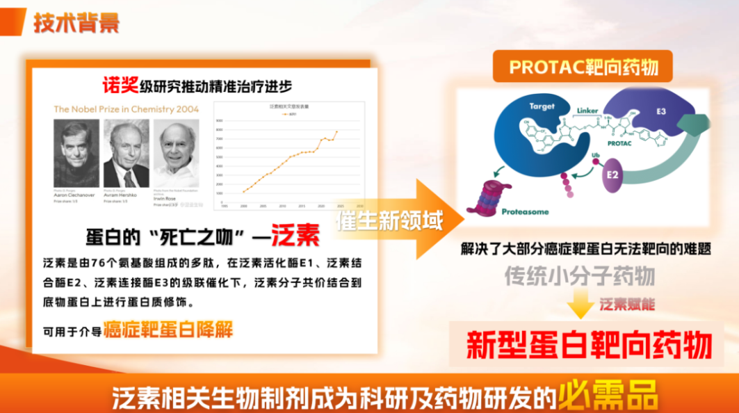 随着人类对疾病发生发展分子机制理解的不断深入,泛素-蛋白酶体系统(UPS)作为细胞“质量控制中心”的核心地位日益凸显。UPS精确调控着关键信号通路蛋白(如致癌蛋白、抑癌蛋白、炎症因子、神经毒性蛋白)的稳定性、活性和定位。其功能失调直接导致蛋白稳态失衡,成为癌症发生、转移、耐药、神经元死亡、异常免疫激活等病理过程的核心驱动力。揭示UPS在疾病进程中的精确作用,并将其作为关键治疗靶点进行干预,已成为攻克癌症、神经退行性疾病、自身免疫性疾病等重大人类健康挑战的突破口。靶向蛋白降解嵌合体(PROTAC)则创新性应用了UPS,PROTAC分子巧妙地劫持了泛素蛋白的标记功能,将传统“不可成药”的致病靶蛋白直接引导至蛋白酶体进行降解,实现从源头上清除疾病驱动因子。UPS的机制研究和创新利用彻底颠覆了传统药物设计的思路,为解决难治性疾病提供了前所未有的武器,UPS的高活性、高纯度蛋白的生产势在必行。