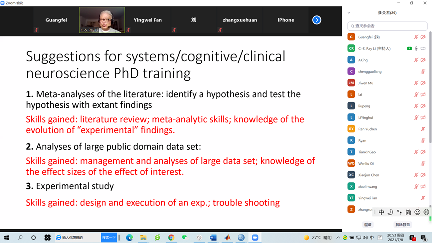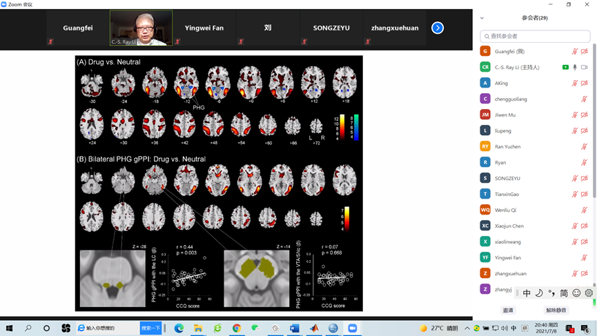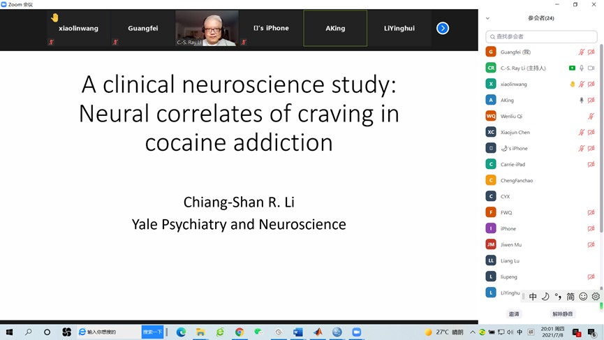 应北京理工大学betway西汉姆联唐晓英教授邀请,2021年07月08日,北京时间晚上八点,耶鲁大学 Chiang-shan Ray Li教授通过Zoom软件为betway西汉姆联师生作了题为《认知神经科学与成瘾机制的前沿研究》的学术报告。报告由betway西汉姆联唐晓英教授,王安聪老师主持,研究生与其他老师共计三十余人参加了报告会。