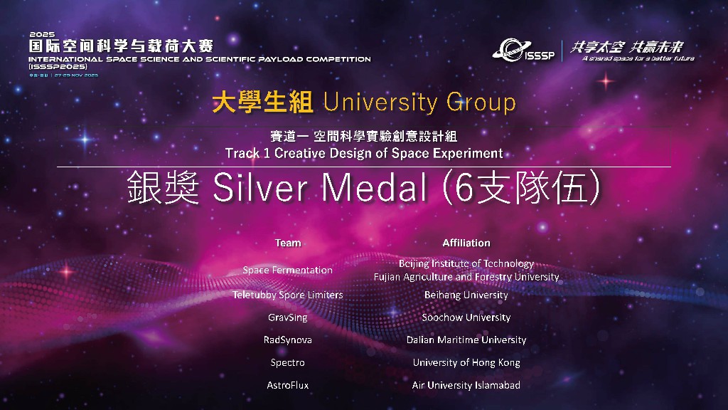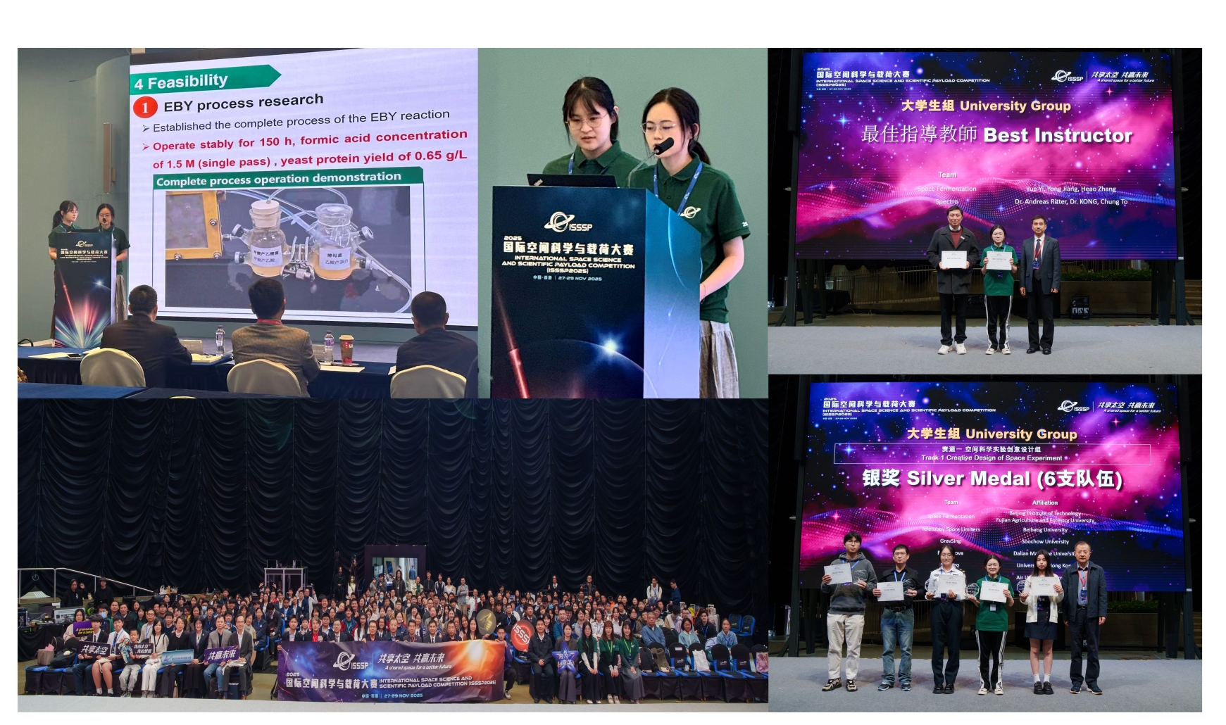 日前,由中国宇航学会、北京理工大学、国际宇航科学院、亚太空间合作组织、国际宇航科技创新组织和澳门科学技术协进会共同主办的2025年“国际空间科学与载荷大赛”(ISSSP)在中国香港圆满落幕。我校作为第一单位,联合福建农林大学共同组建的“太空酵坊队”(Space Fermentation)在本次赛事中表现卓越,荣获赛道一“空间科学实验创意设计组”团体银奖,奖金为人民币2万元。值得一提的是,本届大赛两个赛道均未产生金奖,因此银奖实为赛事最高奖项。同时,该团队还荣获本次赛事最佳指导教师奖,充分彰显了我校在空间科学领域的领先实力。